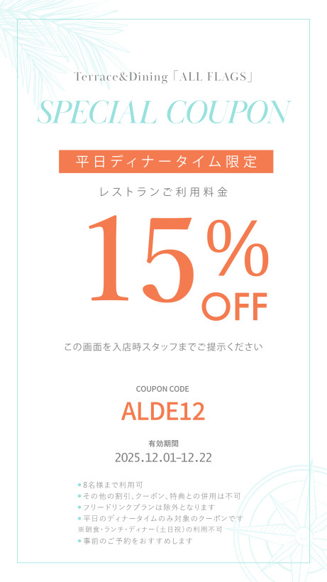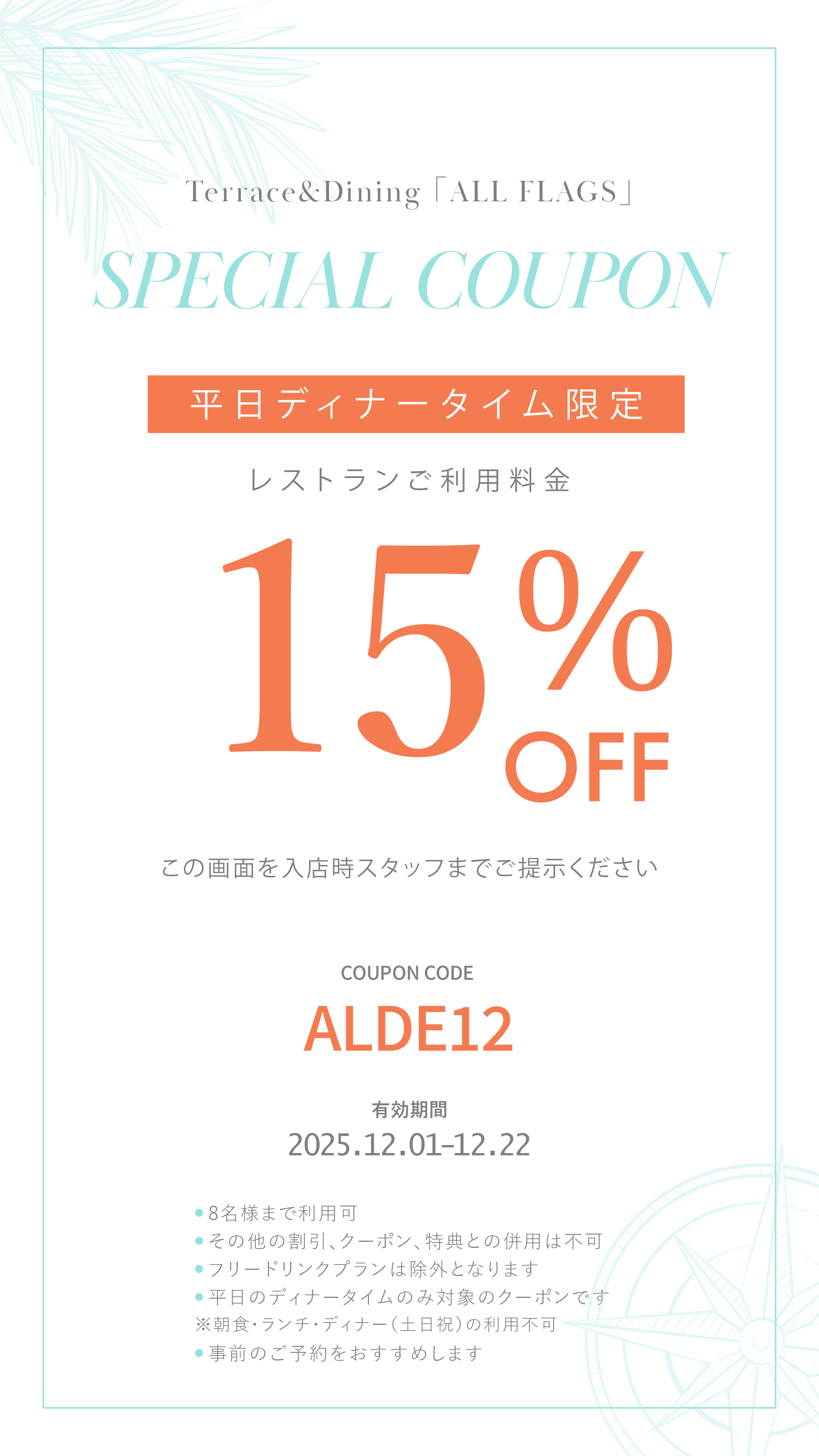 ・平日のディナータイムのみ対象のクーポンです ※朝食・ランチ・ディナー(土日祝)の利用不可
