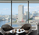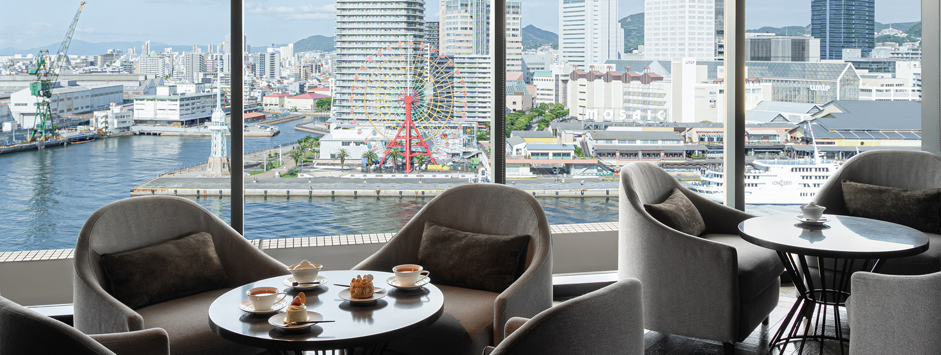 ホテル最上階の当カフェ店内からは、ハーバーランドの観覧車や都会的なビル群が望める西側の眺望と、神戸の象徴、神戸ポートタワーや海洋博物館が望める北側の眺望をお楽しみいただけます。