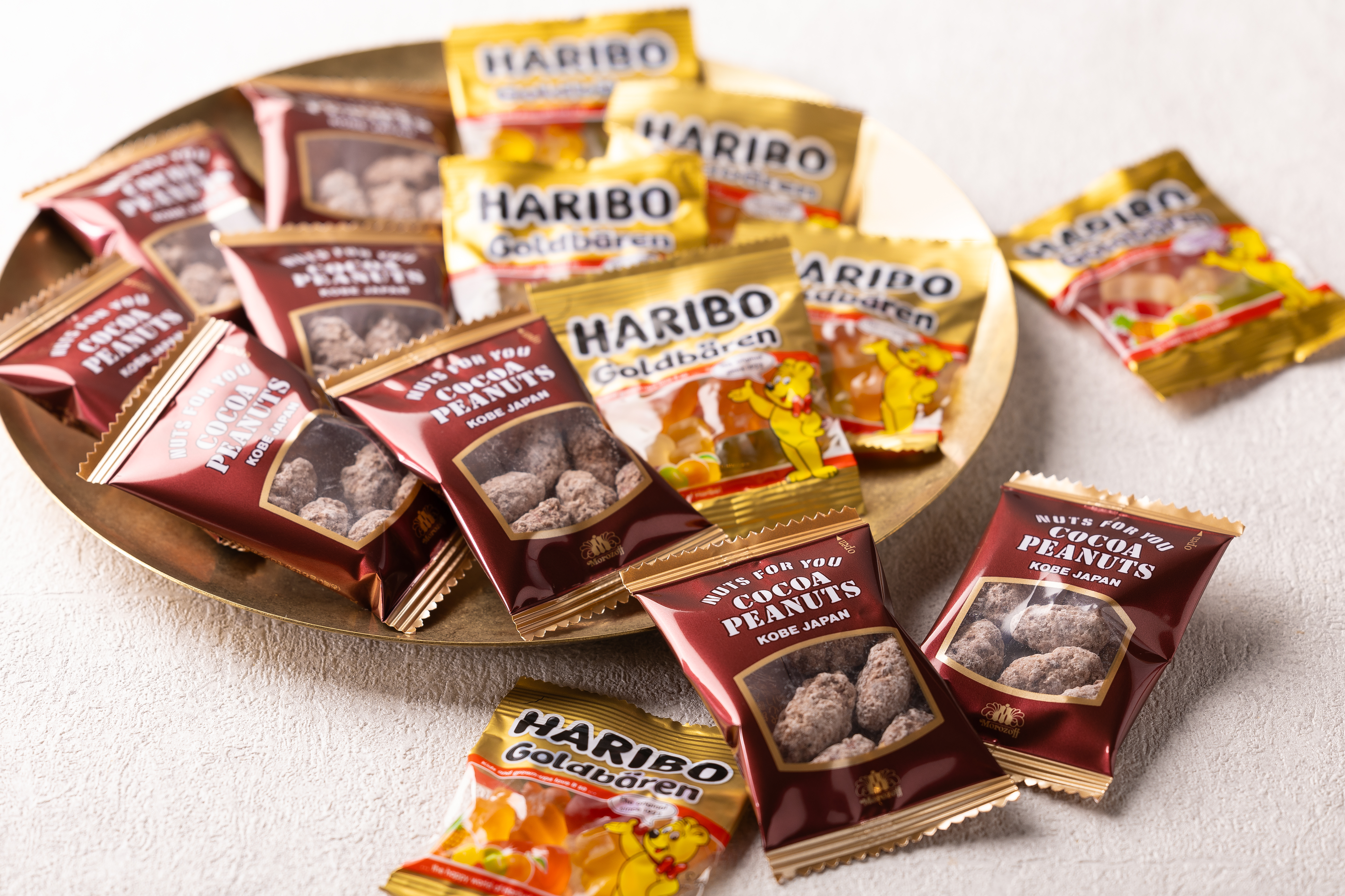 ピーナッツをココア風味で薄く糖衣した「ココアピーナッツ」は、60年以上愛され続けているロングセラー商品の一つ。発売当時のパッケージには南国から船に積んで日本に来るカカオビーンズをイメージした麻袋が使われていました。